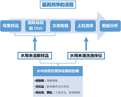 整个测序环节中,从样品收集到上机测序,水贯穿了包括测序仪的日常清洗维护和试剂配制在内的每一个环节。作为一个必不可少的基础试剂,水的品质对最终测序结果会产生显著影响。水中的杂质,如无机盐、有机物、核酸酶、颗粒物等,不仅会污染设备,缩短测序仪毛细管的使用寿命,而且还会降低DNA聚合酶的活性,最终干扰测序结果的准确性。