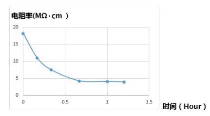 当超纯水开始曝露在大气下时,二氧化碳的溶解就会无可避免的持续下去,我们可以用电阻率的变化来监测这个过程。实践证明15MΩ.cm以上的超纯水暴露在空气中1个小时后水质就会下降至4MΩ.cm左右。